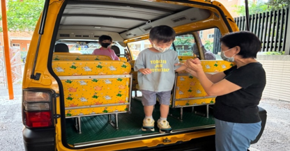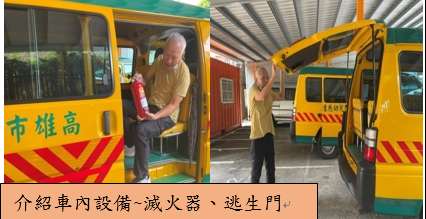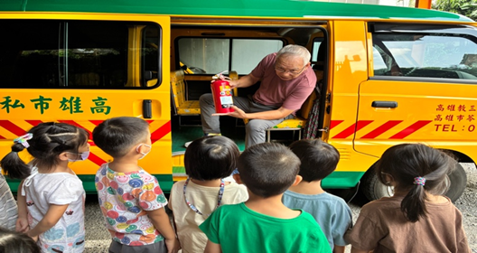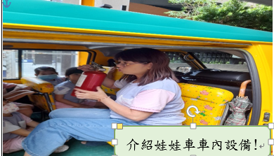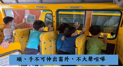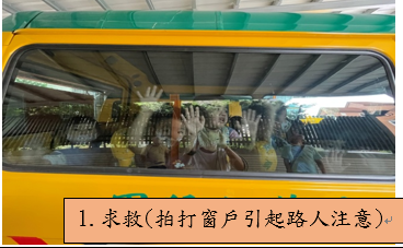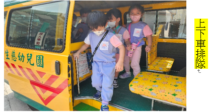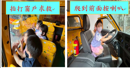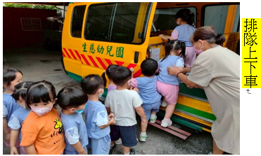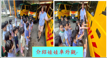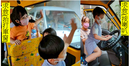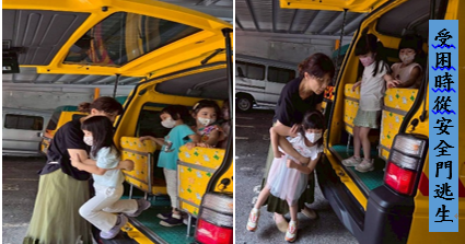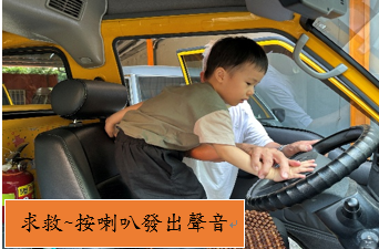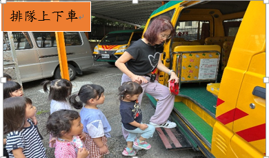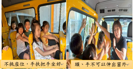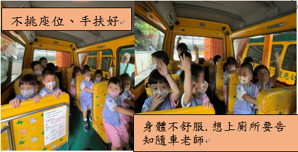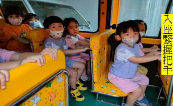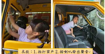本學期娃娃車安全教育演練由各班老師分批演練,除讓孩子認識車輛外觀.安全門位置及使用方法,了解車內設備之外,也教育孩子上下車禮儀及遵守秩序,車輛行進當中要坐好緊握手把,如有身體不適一定要馬上告知隨車老師,最後再實地演練受困在車子裡面門打不開要怎麼辦?該如何自救之演練過程,以加強孩子們的技能概念。